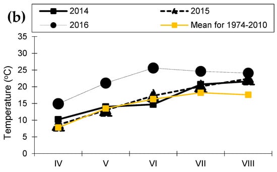 Rainfall (a) and temperature (b) in the vegetation seasons of the years 2014–2016 according to the Meteorological Station at Model Organic Farm in Chwałowice.