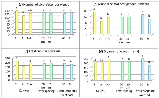 The number of dicotyledonous weeds (a), monocotyledonous weeds (b), total number of weeds (c), and dry mass of weeds (d) in lentil crop as influenced by cultivar, row spacing, and lentil cropping method (mean for 2014–2016). Different letters indicate significant difference at p ≤ 0.05. T: var. ‘Tina’, A: var. ‘Anita’, SC: sole cropping of lentil without a supporting plant, RI: row intercropping of lentil with naked oat.