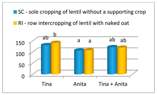 Significant differences in seed yield of lentil cultivars were demonstrated (Figure 7). The variety ‘Anita’ produced the highest yields (11.63 dt ha−1), whereas var. ‘Tina’ and the variety mixture produced significantly lower seed yields, by 20.2% and 13.1%, respectively. In the opinion of Vlachostergios and Roupakias [5] there are large possibilities to increase seed yield of lentil grown under organic farming conditions through appropriate variety selection.