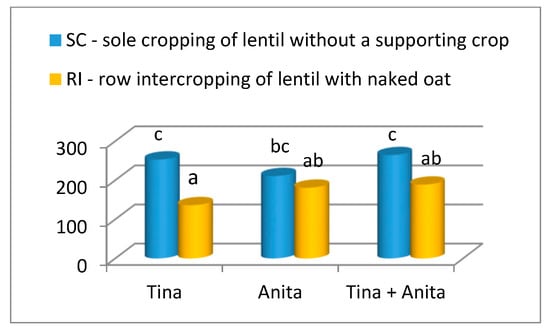 The interaction effect of cultivar and lentil cropping method on the air dry weight of weeds in lentil crop (g m−2) (mean for 2014–2016; independent on row spacing). Different letters indicate significant difference at p ≤ 0.05. SC: sole cropping of lentil without a supporting plant, RI: row intercropping of lentil with naked oat.