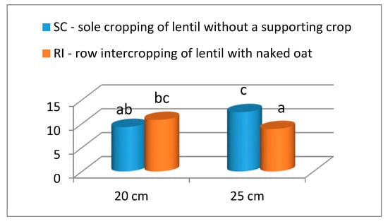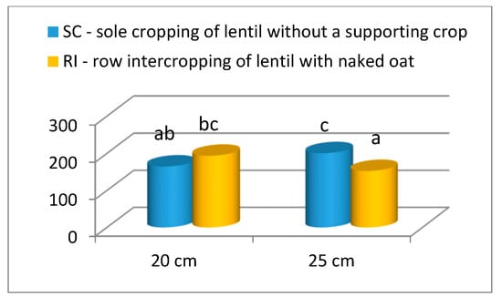 The interaction effect of row spacing and lentil cropping method on the total number of weeds in lentil crop (plant m−2) (mean for 2014–2016; independent on cultivar). Different letters indicate significant difference at p ≤ 0.05. SC: sole cropping of lentil without a supporting plant, RI: row intercropping of lentil with naked oat.