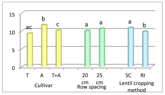 In the present study, the lentil seed yield in the treatments with different row spacings did not differ significantly, though in the case of a row spacing of 25 cm it was slightly higher (by 6.1%) than in the plots where lentil was sown at a spacing of 20 cm. In a study by Ouji et al. [35], lentil sown at a row spacing of 34 cm produced a 38% higher yield compared to a spacing of 17 cm. Bicer [31] believes that increased lentil crop density results in greater competition between plants and leads to a weakening of individual plants.