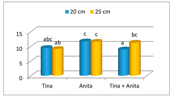 Statistical analysis confirmed the significant interaction between cultivars and lentil cropping method. Var. ‘Anita’, both cropped with and without oats, was the most competitive against dicotyledonous weeds (Figure 4). However, the lowest air dry mass of weeds was found in the var. ‘Tina’ intercropped with oats (Figure 5). The presence of oats as a supporting crop significantly reduced the air dry mass of weeds in the var. ‘Tina’ and mixture of ‘Tina’ and ‘Anita’ crops. This study demonstrated that row intercropping of lentil with naked oats significantly decreased the total number of weeds in the treatment with the row spacing of 25 cm but had no significant effect in the narrower row spacing (20 cm) (Figure 6).