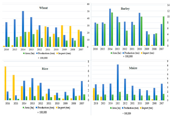 The annual average data of cultivated area (ha), production (ton), and import (ton) for wheat, barley, rice, and maize crops, 2007–2016.