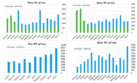For barley, in the northern three provinces, there was more reliance placed on rainwater, there were 409,908 tons (49%) of the total 833,815 tons produced in the 296,510 ha (48%) from 622,666 ha total area (Table 1 and Figure 4). Rice production in Iraq as a summer crop, with a big concentration around Najaf province, is primarily cultivated in the irrigated provinces of central and southern Iraq and not cultivated in the north, with an output rate reaching 269,970 ton/year (Table 1 and Figure 4). Production of maize in Iraq as a summer crop of feed is in all 15 provinces, especially Babylon and Wasit in the middle and Kirkuk in the north (Table 1 and Figure 4). It is clear from Table 1 and Figure 4 that Iraq’s annual production of the four crops fluctuates and is not sufficient for its local needs due to the amount of rainfall most often. This is compensated by imports from abroad, especially wheat and rice. The detailed WF of the 4 crops is provided in the following paragraphs, Figure 5 and Figure 6.