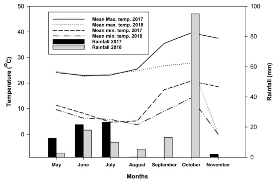 Weather parameters (mean maximum and minimum temperature, and rainfall) recorded in 2017 and 2018 during the growth duration of barley crop.
