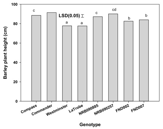 In the present study, Commander had high WSA and WTA parameters owing to its greater height and panicle production when compared with other genotypes. Therefore, this work suggests that a high tillering ability and taller plant height are desirable attributes for weed competitiveness in barley genotypes. This is consistent with previous weed-competitive studies of different crops [10,30,31].