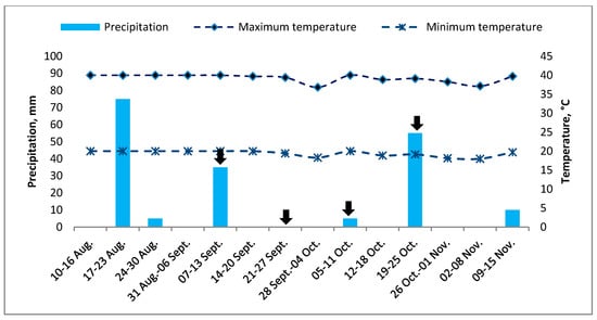Precipitation and temperature weekly values during the cowpea bean (Vigna unguiculata L. Walpers) cultivation cycle. Arrows indicate zinc application dates.