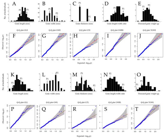 Frequency distribution of traits and quantile-quantile plots. (A–E) Frequency distribution of grain length (GLE), grain width (GWE), grain thickness (GTE) grain length–width ratio (LWRE), and thousands grain weight (TGWE) of 117 rice doubled haploid lines for early-transplanting. (F–J) Quantile–Quantile (Q–Q) plots for GLE, GWE, GTE, LWRE, and TGWE for early-transplanting period, (K–O) frequency distribution of grain length (GLL), grain width (GWL), grain thickness (GTL), grain length–width ratio (LWRL), and thousands grain weight (TGWL) at late-transplanting. (P–T) Q-Q plots for GLL, GWL, GTL, LWRL, and TGWL for late transplanting period. –log10(p) is the negative logarithm base 10 quantile-quantile (Q-Q) of the P-values (expected and observed) for traits.