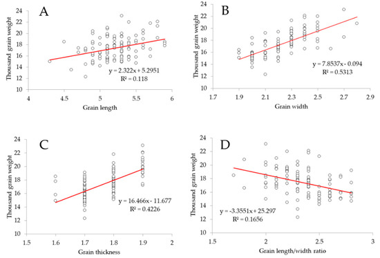 Previous reports have suggested that grain weight is affected by grain shape attributes, such as grain length, width, thickness, and grain length–width ratio. The results of the linear regression analysis (Figure 2) revealed that of all the evaluated rice grain traits, only grain width and grain thickness showed a strong positive correlation with grain weight (here expressed as thousand grain weight). On the contrary, a very weak positive correlation, which could also be regarded as a non-existing correlation, was observed between grain length and grain weight, while a very weak negative correlation was recorded between grain length–width ratio and grain weight. It is then suggested that a unit increase in grain width would result in an increase in grain weight by one unit. Similarly, an increase in grain thickness would increase grain weight by the same measure. In addition, changes in grain length or grain length–width ratio would not cause fundamental changes in rice grain weight.