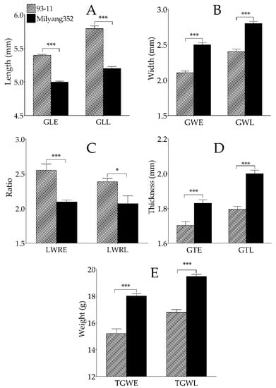 Distinctive rice grain traits of 93-11 (P1, indica) and Milyang352 (P2, japonica). (A) Length of rice grains of parental lines, 93-11 (P1) compared to Milyang352 (P2), at early- and late-transplanted rice. (B) Grain weight of P1 and P2 recorded at early- (GLE) and late- (GLL) transplanting periods. (C) Grain length–width ratio (LWRE, for early-transplanted rice; LWRL, for late-transplanted rice) of P1 and P2. (D) Grain thickness (GTE, for early-transplanted rice; GTL, for late-transplanting) of P1 and P2. (E) Thousand grain weight (TGWE, for early- transplanting, and TGWL, for late-transplanting) of parental lines. Bars are mean values ±SD. *** P < 0.001, * P < 0.05.