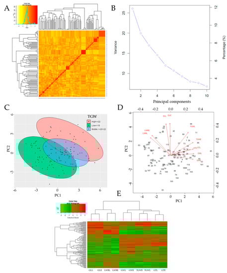 From another perspective, the data in panel E in Figure 4 groups GL and LWR in the same cluster, while GW, TGW, and GT are assigned to a different cluster (column dendrogram on top). Principal component 1 (PC1), 2 (PC2), and 3 (PC3) explained 26.4%, 18.4%, and 12.1% of the proportion of variance of the observed grain traits phenotypes, respectively, resulting in a cumulative proportion of 56.9%.