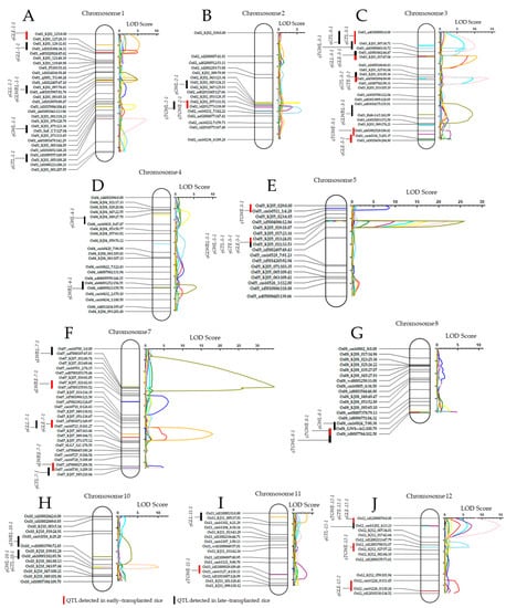 The genotype and phenotype data were used to perform linkage mapping and QTL analysis. The results revealed that a total of 48 QTLs (all traits considered) associated with the studied grain traits, were mapped to all rice chromosomes, except chromosomes 6 and 9 (Table 1, Figure 5A–J). In essence, seven QTLs (qGLE-1-1, logarithm of the odds (LOD) of 4.85; qGLE-3-1, LOD: 8.1; qGLE-3-1, LOD: 8.1; qGLE-3-2, LOD of 3.1; qGLE-5-1, LOD of 3.9; qGLE-7-1, LOD: 5.7; qGLE-12-1, LOD: 4.1; and qGLE-12-2, LOD: 3.9) were associated with grain length (GLE) of early-transplanted rice DH lines (Table 1, Figure 5).