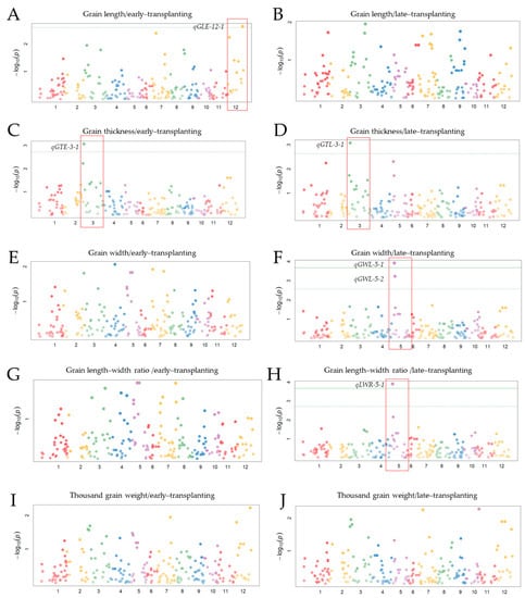 From another perspective, we were interested to investigate the possibility of detecting similar genetic loci, and sustain their association with rice grain shape or weight, using two widely known genetics approaches (linkage mapping and Genome-Wide Association Study, GWAS). We therefore performed a GWAS based on the same genotype and phenotype data used for linkage mapping and QTL analysis. It was interesting to see that qGLE-12-1 and qGLE-12-2, mapped to chromosome 12 (cmb1202_4 and cmb1226_0 are closest KASP markers, respectively) (Figure 6A) and associated with grain shape and weight, were detected equally by GWAS and linkage mapping. Similarly, using both approaches, qGTE-3-1 (associated with grain thickness) earlier detected by linkage mapping, was also identified by GWAS on chromosome 3, with the same KASP marker linked to the QTL (KJ03_007) (Figure 6C,D). In the same way, qGWL-5-1, associated with grain width (GW) of late-transplanted rice, was detected, and KJ05_013 KASP marker was linked to the QTL (Figure 6F). In addition, qLWRL-5-1, associated with grain length–width ratio in late-transplanted rice, was also detected by both linkage mapping and GWAS on chromosome 5, with KASP marker KJ05_017 being closer to the QTL (Figure 6H). In contrast, significant QTLs for grain weight (TGW) were only identified by linkage mapping but not GWAS, as observed in the study under both early- and late-transplanting periods.