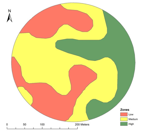 Site-specific management zones were previously delineated on the study field based on the methodology described by [13]. The field was classified into productivity potential management zones of low, medium, and high, and these are referred to as zones 1, 2, and 3, respectively (Figure 1). Specifically, bare-soil aerial imagery, topographic maps and the farmer’s experience of yield history were utilized to classify the areas of field into three management zones.