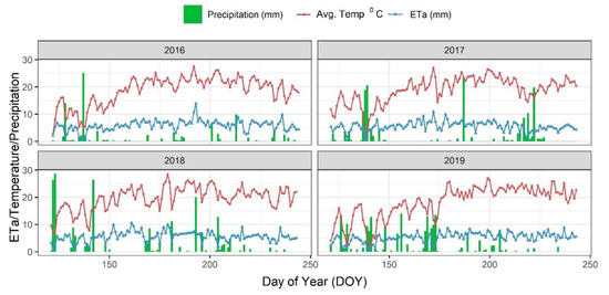 Time series plot of daily precipitation (mm), average temperature (0 °C), and actual evapotranspiration (ET) (mm) for the years 2016, 2017, 2018, and 2019 at the experiment site.