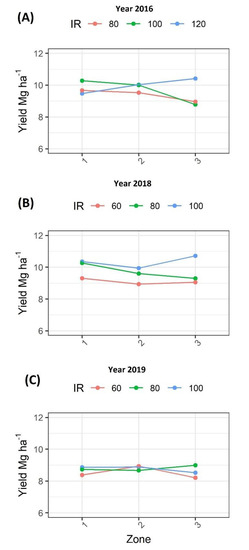 A further breakdown of the interaction between zone and irrigation is presented in Figure S1 by plotting the interaction at each nitrogen level. The interaction within each nitrogen rate follows the same trend as in the overall interaction (Figure 3). Only in year 2016 did we have an irrigation rate that was 120% of ET, and we observed that the high productivity zone (3) recorded significantly greater yield at all nitrogen levels as compared to lower irrigation rates. Year 2018 exhibited similar trend as in year 2016.