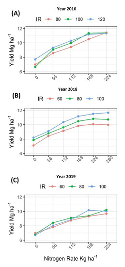 Significant irrigation and nitrogen interaction in all three years highlights the importance of fine-tuning water and fertilizer input for maximizing yield. Our results are in concordance with past studies, which showed a significant interaction of nitrogen and irrigation in maize yield and growth [60,61,62]. The results from the year 2016 show that at high nitrogen rates (224 kg N ha−1), irrigation rates did not affect yield, and all rates produced the highest yield that year. However, the same level of yield was obtained by using 100% ET irrigation and 168 kg N ha−1 nitrogen, or 80% ET and 224 kg N ha−1 nitrogen. In 2019, the yield achieved with 60% ET irrigation and 112 kg N ha−1 was statistically on par with all other combinations of higher irrigation and nitrogen rates. High N rates associated with low irrigation rates could result in excess N, which could not be used by the plant due to water stress. Over time, the excess N could be transported to waterways and contaminate the environment [4]. Our results are supported by the study by [63], who reported a synergistic relationship between irrigation and nitrogen rates and improvement in water use efficiency in maize; however, the maximum nitrogen rate was only 100 kg N ha−1. This result has important implications for the cost-effective management of agricultural inputs (water and fertilizer). If water is not limited, there is an opportunity to reduce the nitrogen rate without yield penalty, and vice versa. Given that the experiment was conducted in the semi-arid environment of Colorado, the effect of irrigation on yield was much more intense than N rates.