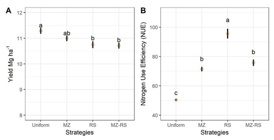 Plots showing the effect of different nitrogen management strategies in (A) yield and (B) NUE. Different letters indicate significant difference between strategies (at α = 0.05).