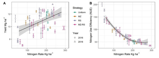 Response of (A) maize grain yield (B) and nitrogen use efficiency (NUE) (kg grain/kg N) with respect to amount of applied nitrogen, in four nitrogen management strategies (uniform, MZ = management zones, RS = remote sensing, MZ-RS = management zones and remote sensing), across 2016 and 2018.
