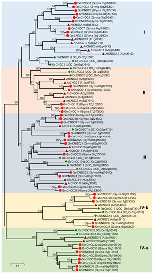 Unrooted phylogenetic tree of the cyclic nucleotide-gated ion channel (CNGC) family proteins from soybean (Glycine max), rice (Oryza sativa), and Arabidopsis thaliana. The alignment for the phylogenetic tree was performed with ClustalW using full-length amino acid sequences. The phylogenetic tree was created with the MEGA6 software and the neighbor-joining method with 1000 bootstrap replications. GmCNGCs are marked with red circles, AtCNGCs were marked with purple triangles, while OsCNGCs were marked with green diamonds. The locus name of each gene is shown in brackets. The bar indicates the relative divergence of the sequences examined, and bootstrap values are displayed next to the branch. Roman numerals designate the subfamilies.