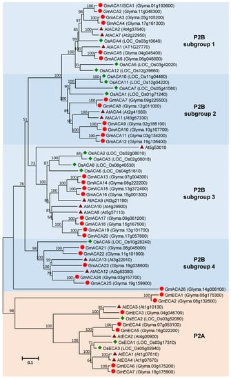 Unrooted phylogenetic tree of the Ca2+-ATPase family proteins from soybean (Glycine max), rice (Oryza sativa), and Arabidopsis thaliana. The alignment for the phylogenetic tree was performed with ClustalW using full-length amino acid sequences. Soybean Ca2+-ATPases are marked with red circles, Arabidopsis Ca2+-ATPases were marked with purple triangles, while rice Ca2+-ATPases were marked with green diamonds. The locus name of each gene is shown in brackets. The bar indicates the relative divergence of the sequences examined, and bootstrap values are displayed next to the branch.