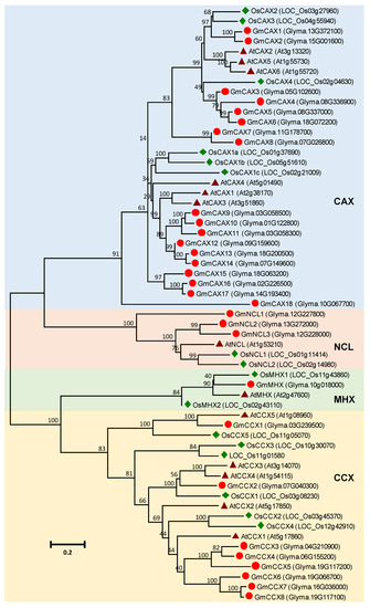 Unrooted phylogenetic tree of the CaCA (Ca2+/Cation Antiporter) family proteins from soybean (Glycine max), rice (Oryza sativa), and Arabidopsis thaliana. The alignment for the phylogenetic tree was performed with ClustalW using full-length amino acid sequences. Soybean CaCAs are marked with red circles, Arabidopsis CaCAs were marked with purple triangles, while rice CaCAs were marked with green diamonds. The bar indicates the relative divergence of the sequences examined, and bootstrap values are displayed next to the branch.