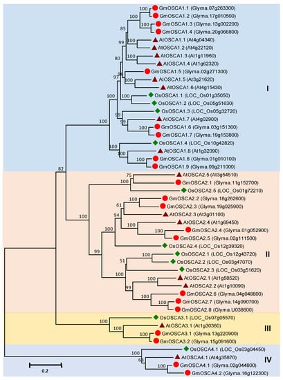 Unrooted phylogenetic tree of the OSCA family proteins from soybean (Glycine max), rice (Oryza sativa), and Arabidopsis thaliana. Soybean OSCAs are marked with red circles, Arabidopsis OSCAs were marked with purple triangles, while rice OSCAs were marked with green diamonds. The bar indicates the relative divergence of the sequences examined, and bootstrap values are displayed next to the branch. Roman numerals designate the subfamilies.