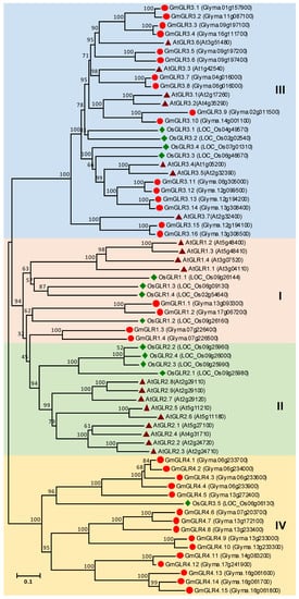 Unrooted phylogenetic tree of the glutamate receptor-like (GLR) family proteins from soybean (Glycine max), rice (Oryza sativa), and Arabidopsis thaliana. Soybean GLRs are marked with red circles, Arabidopsis GLRs were marked with purple triangles, while rice GLRs were marked with green diamonds. The bar indicates the relative divergence of the sequences examined, and bootstrap values are displayed next to the branch. Roman numerals designate the subfamilies.