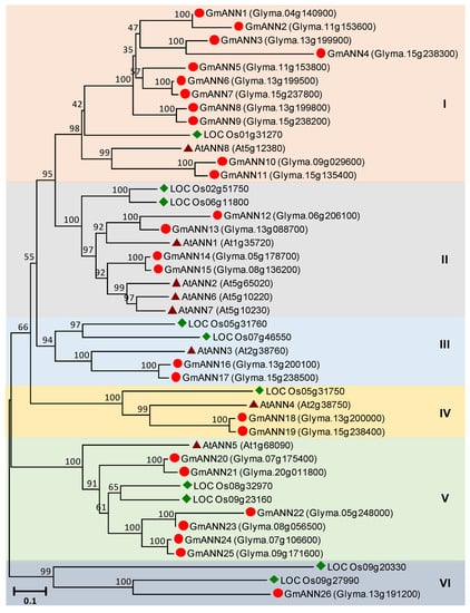A total of 26 ANN genes were identified in the soybean genome; they were designated as GmANN1 to GmANN26 (Table S7 (Supplementary Materials)). Three to seven introns were found in these genes, and their protein length ranged from 141 to 362 amino acids, with a typical length of 296 amino acids (Table S7 (Supplementary Materials)). All the GmANN proteins were predicted to contain annexin domains, and their sequences are highly conserved (Figures S8 and S9 (Supplementary Materials)). A phylogenetic tree was constructed using full-length amino acid sequences of all the ANNs in soybean, Arabidopsis, and rice. These ANNs could be grouped into six clades (Figure 7). Clade I contains 11 GmANN members, clade V contains five GmANN members, while other clades contain one to four members. In each clade, proteins from soybean, Arabidopsis, and rice are included, with the exception that there is no Arabidopsis ANN in clade VI (Figure 7). These results suggest the similar clustering of ANN proteins in these three plants.