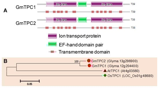 Although there is only one TPC member in Arabidopsis and rice, two orthologues were identified in the soybean genome, and designated as GmTPC1 and GmTPC2 (Table S8 (Supplementary Materials)). These two genes both contain 23 introns and encode proteins with an amino acid length of 738–739. Twelve to thirteen transmembrane domains were predicted for these two proteins (Figure 8A). Similar to AtTPC1 and OsTPC1, ion transport protein domain and EF-hand pair were found in GmTPC1 and GmTPC2 (Figure 8A). Phylogenetic analysis indicated that GmTPC1 and GmTPC2 are closely related to the AtTPC1 and OsTPC1 (Figure 8B).