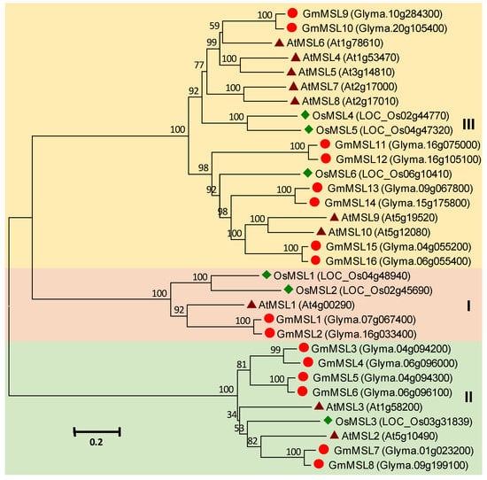 Unrooted phylogenetic tree of the MscS like protein (MSL) family proteins from soybean (Glycine max), rice (Oryza sativa), and Arabidopsis thaliana. Soybean MSLs are marked with red circles, Arabidopsis MSLs were marked with purple triangles, while rice MSLs were marked with green diamonds. The bar indicates the relative divergence of the sequences examined, and bootstrap values are displayed next to the branch. Roman numerals designate the subfamilies.