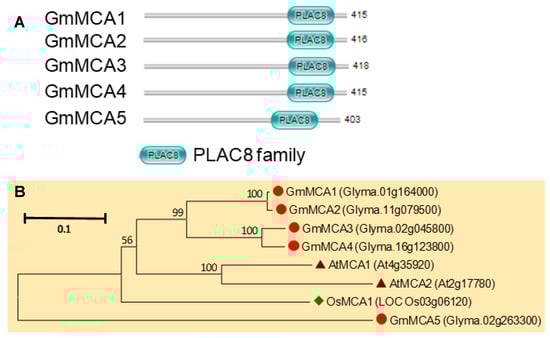 Five loci were found to be potential MCA genes; these genes designated as GmMCA1 to GmMCA5 contain five to eight introns and encode proteins with a length of 403 to 418 amino acids (Table S10 (Supplementary Materials)). The protein sequences of MCAs are very conserved (Figure S11 (Supplementary Materials)). All the GmMCAs contain a putative transmembrane domain and a Cys-rich domain of the unknown function, called the PLAC8 motif (Figure 10A). A phylogenetic tree indicated that GmMCAs are closely related to the three proteins in Arabidopsis and rice (AtMCA1, AtMCA2, and OsMCA1) (Figure 10B).