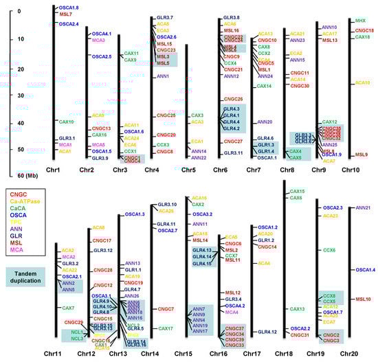 Graphical representation of locations for all the Ca2+ transport genes on each chromosome of soybean. Genes within the same family were marked in the same color. Genes within a light blue box are putatively tandemly duplicated.