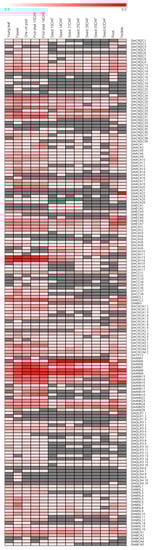 The expression profiles of genes encoding putative Ca2+ transport proteins in different developmental stages of soybean were analyzed by using two publicly available RNA-seq datasets. The first dataset contains 14 tissues, including three vegetative tissues (leaves, root, and nodules) and whole seed at 11 stages of reproductive tissue development (flower, pod, and seeds) []. The second dataset contains nine tissues (root hair cells isolated 84 and 120 h after sowing (HAS), root tip, root, mature nodules, leaves, shoot apical meristem (SAM), flower and green pods) []. A total of 166 and 194 genes had detectable expression in at least one tissue in the first and second datasets, respectively (Figure 12 and Figure S12 (Supplementary Materials)). There is no corresponding locus name of version 1.0 (Wm82.a1.v1 used by the RNA-seq data) for 13 genes (GmCNGC23, GmACA18, GmACA24, GmCAX7, GmCAX12, GmOSCA2.4, GmOSCA2.8, GmTPC1, GmANN2, GmANN12, GmANN20, GmGLR4.1, GmGLR4.2). In addition, the expression of 28 genes could not be found in the first dataset (Figure 12). These genes could be expressed exclusively under specific developmental stages or environmental conditions. Consistently, these genes showed very low expression levels in tissues of soybean in the second dataset, such as GmCNGC4/10/11/21, GmACA3/4/7/8, and GmOSCA1.7/2.2/2.6 (Figure S12 (Supplementary Materials)). As shown in both datasets, some genes were expressed ubiquitously in diverse tissues, whereas some genes are tissue-specific. For example, GmCNGC12/13/14/25/26, GmACA5/9/11/13/17, GmCAX1/2/8, and GmOSCA3.1/3.2/4.1/4.2 were ubiquitously expressed in various tissues, GmCNGC33, GmACA21/22, GmCAX4, GmCCX4, and GmGLR4.6 were predominantly expressed in root nodule; GmCNGC20, GmACA16, GmOSCA1.6, and GmGLR1.2/4.8/4.9/4.10 were expressed exclusively in the flowers; GmCNGC29 and GmANN5 had strong expression during seed development (Figure 12 and Figure S12 (Supplementary Materials)).