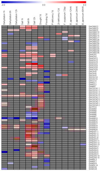 Heatmap representation for transcriptional responses of Ca2+ transport genes under environmental stresses like salt in roots, dehydration in roots, flooding in leaves, drought in leaves, phosphorus deficiency in roots, zinc deficiency in roots, and inoculation of pathogenic isolates of Fusarium oxysporum (72 h post-inoculation, hpi) in roots, and inoculation of symbiotic soil bacteria Bradyrhizobium japonicum (12–48 h after inoculation, HAI) in root hairs. The intensities of the color represent the relative magnitude of fold changes in log2 values according to high-throughput sequencing data (Fold change ≥ 2, p-value < 0.05). The red color indicates induction, the blue color indicates repression, and the gray color means there is no significant expressional change.