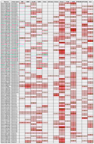 3.14. Hormone and Stress-Related Cis-Elements in the Promoters