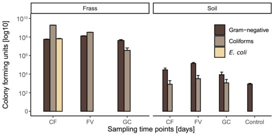 Before and after applying frass as soil amendment, the number of cultivable E. coli, coliform, and other gram-negative bacteria were assessed (Figure 1). While frass counted up to 109 CFU g−1, the count in soil was down to 103–105 g−1. With the nutrient media used in this study, untreated soil contained no cultivable E. coli or coliforms, and only low abundances of cultivable gram-negatives with 102 CFUs g−1. In particular, frass from the CF treatment acted as a reservoir for coliforms with a CFU count of 1.9 × 109, thereby exceeding CFU counts recorded on larval surfaces (Figure S2). Gram-negative bacteria predominated the cultivable microbiota in frass-amended soil with highest CFU counts of up to 105 in soil treated with frass from a FV diet. High microbial load and dominance of coliforms in frass shifted to lower CFU numbers and predominantly gram-negative bacteria in the frass-soil mix, indicating that the autochthonous soil microbiota outcompeted allochthonous microorganisms introduced with frass [49,50,51].