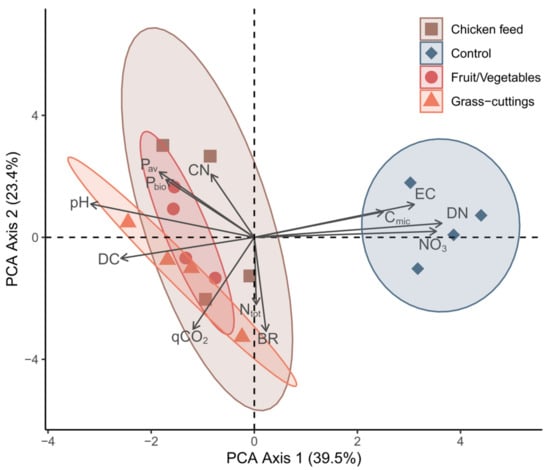 Principal component analysis of samples from control soil and soil mixed with the three different frass types. Data points represent replicates, and arrows show the most influential parameters for the spread of the data. NO3 = Nitrate, DN = Dissolved nitrogen, CN = Carbon/Nitrogen ratio, Pbio = Phosphorus bioavailability, BR = Soil basal respiration, qCO2 = Metabolic quotient, Cmic = Microbial biomass, Ntot = Total nitrogen, Pav = Plant available phosphorus, DC = Dissolved carbon, EC = Electric conductivity.