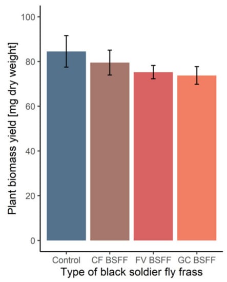 Plant biomass yield of Lolium perenne after application of black soldier fly frass (BSFF) obtained from the degradation of various organic substrates. CF BSFF = Chicken feed frass, FV BSFF = Fruit/vegetables frass, GC BSFF = Grass-cuttings frass (n = 4).