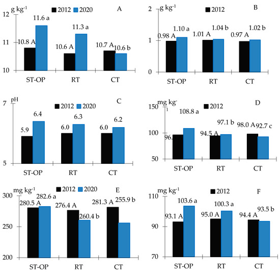 Soil chemical properties (A—content of organic carbon, B—content of total nitrogen, C—pH value, D—content of available phosphorus, E—content of available potassium, F—content of available magnesium) as a result of 8 years of different tillage systems—black columns; strip-till one-pass (ST-OP), reduced (RT), conventional (CT) and before starting a field experiment—blue columns. A—homogeneous group of results in 2012; a, b, c—letters indicate significant differences in 2020 at p < 0.05, n = 4.