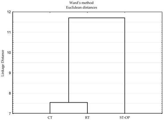 Dendrogram of soil tillage treatments: strip-till one-pass (ST-OP), reduced (RT), and conventional (CT).