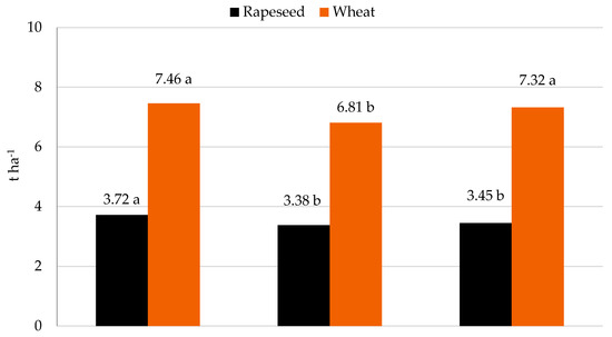 The yield of winter wheat grain using ST-OP technology during the research period was, on average, comparable to the yield using conventional technology and was significantly higher, by 0.65 t ha−1, than that using RT technology (Figure 4). On the other hand, the yield of winter rapeseed grown using ST-OP technology was significantly higher than that using both CT and RT technology, by 0.27 ha−1 and 0.34 t ha−1, respectively.