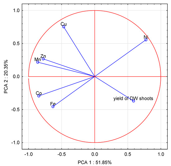 Yield of dry weight (DW) shoots and concentration of trace elements in shoots of maize (Zea mays L.) illustrated with the principal component analysis (PCA) method. Results of PCA performed with yield of DW shoots and concentration of Cu, Zn, Ni, Mn, Fe and Co in shoots of maize.
