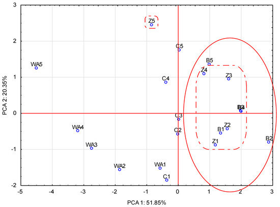 Effect of amendments on yield of DW shoots and concentration of trace elements in shoots of maize (Zea mays L.), illustrated with the PCA method. Results of PCA performed with yield of DW shoots and concentration of trace elements in shoots of maize (WA—without amendments; C—compost; B—betonite; Z—zeolite; 1—0 mg; 2—50 mg; 3—100 mg; 4—150 mg; 5—200 mg Cu/kg of soil.