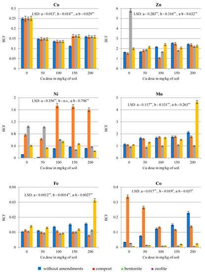 Bioconcentration factor (BCF) of copper (Cu), zinc (Zn), nickel (Ni), manganese (Mn), iron (Fe) and cobalt (Co) in shoots of maize (Zea mays L.). LSD significant for: ** p ≤ 0.01, * p ≤ 0.05; n.s.—non-significant.