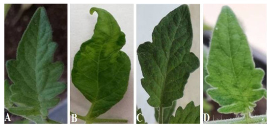 Disease symptoms on tomato leaves infected with tobacco mosaic virus (TMV) at 21 days post-inoculation. (A) Mock-treated plants. (B) Plants inoculated with TMV only. (C) Plants treated with Streptomyces cellulosae isolate Actino 48 only. (D) Plants treated with Actino 48 before inoculation with TMV (48 h).