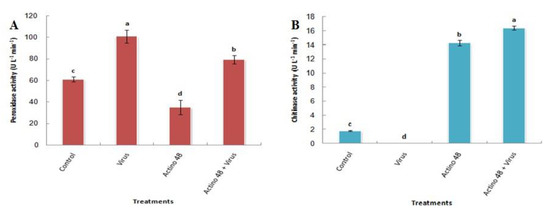 In this study, cell pellet suspension of Actino 48 in the presence of TMV showed significant increases in chitinase activity, followed by cell pellet suspension alone when compared to the control and TMV treatments. Chitinase activity was recorded as 16.4 U L−1 min−1 in tomato plants treated with the cell pellet suspension and inoculated with TMV, while it reached 14.3 U L−1 min−1 in tomato plants treated with the cell pellet suspension alone. No response was observed for chitinase activity in tomato plants inoculated with TMV (Figure 2B).