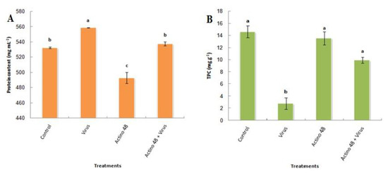 In the current study, protein content significantly increased in tomato plants infected with TMV followed by the treatment with Actino 48 and TMV, and the untreated tomato plants (control plants) showed no significant differences between each other. The obtained results may be related to the presence of the coat protein of TMV. Our results are similar to the results obtained by Barakat et al. [55], who reported an increasing protein content in watermelon plants infected with watermelon mosaic virus-2 (WMV-2) compared to other treatments.