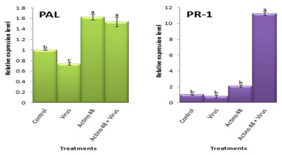 In the present study, only the Actino 48 + virus treatment showed a slight induction of PR-3, encodeschitinase activity [65], with a relative expression level representing a 1.2-fold higher change than the control plants. We assumed that PR-3 expression may not be specific to TMV infection in tomato plants [36]. In addition, the upregulation or downregulation of PR-3 may depend on the viral isolate, type of plant, and plant genotype [66,67,68].